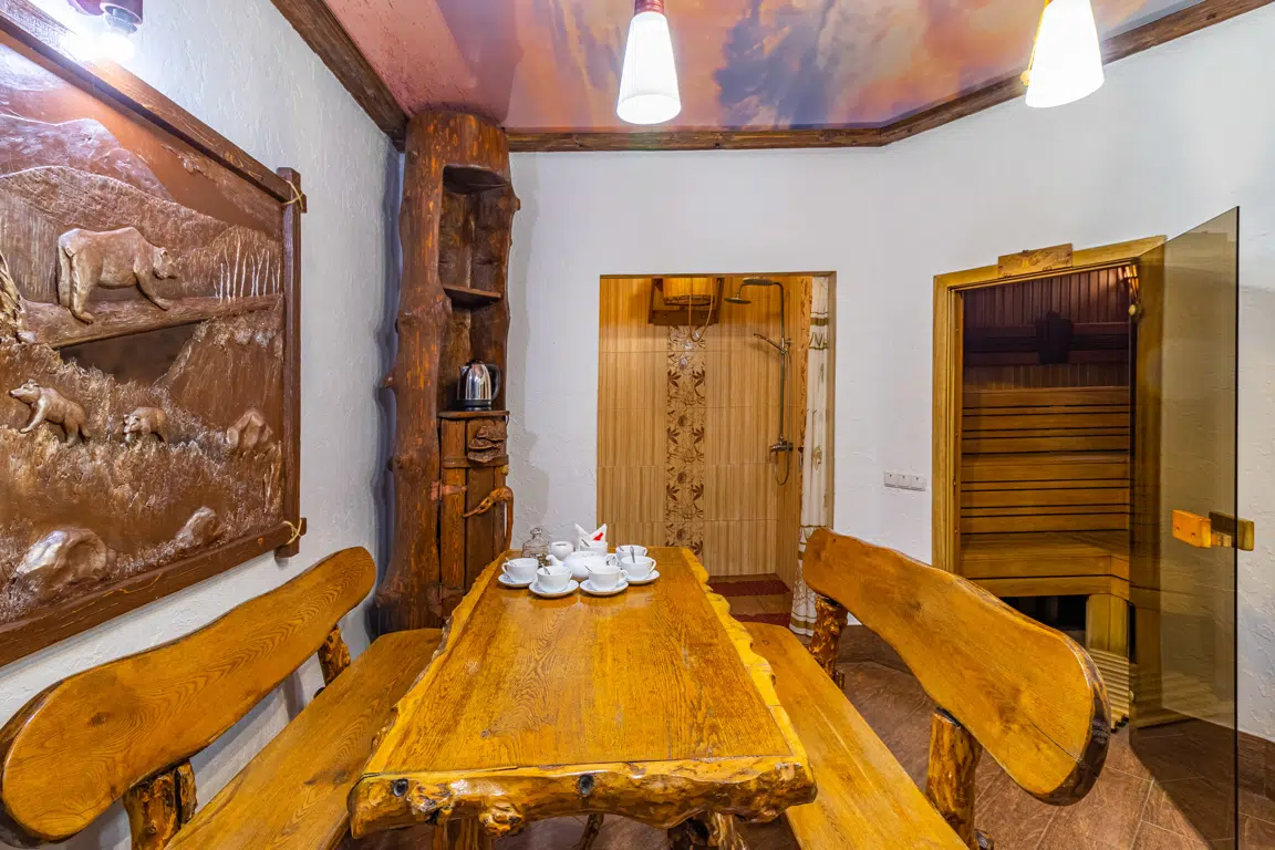 Сауна Nikolleta - розрахована на комфортне перебування 6 осіб. Інтер'єр сауни оформлений із застосуванням натурального дерева. До Ваших послуг: кімнати відпочинку, російсько-фінська парна на 6 осіб з температурним режимом 80-125 градусів, душова кабіна, басейн на 460 літрів, душова і туалетна кімната. Наша сауна пропонує широкий спектр послуг: пропарювання, всі види масажу і смачні трав'яні чаї. Сауна залишить незабутні враження після приємного відпочинку проведеного в ній!